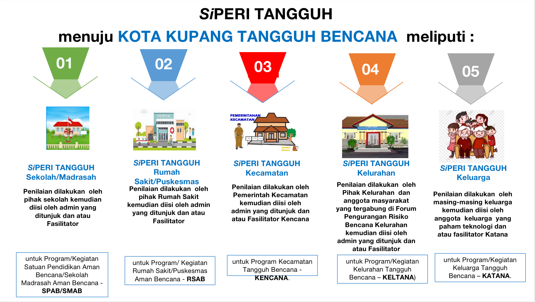 <ul> <li>SiPERI TANGGUH Sekolah: dilakukan sendiri oleh pihak sekolah kemudian diisi oleh admin yang ditunjuk dan atau Fasilitator Sekolah atas ijin dari sekolah.</li> <li>SiPERI TANGGUH Rumah Sakit: dilakukan sendiri oleh pihak Rumah Sakit kemudian diisi oleh admin yang ditunjuk dan atau Fasilitator atas ijin rumah sakit</li> <li>SiPERI TANGGUH Kecamatan: dilakukan sendiri oleh Pemerintah Kecamatan kemudian diisi oleh admin yang ditunjuk dan atau Fasilitator bersama-sama dengan pemerintah kecamatan</li> <li>SiPERI TANGGUH Kelurahan: dilakukan sendiri oleh Pihak Kelurahan (Lurah/RT/RW dan anggota masyarakat kelurahan yang tergabung di Forum Pengurangan Risiko Bencana Kelurahan) kemudian diisi oleh admin yang ditunjuk dan atau Fasilitator bersama-sama dengan Forum.</li> <li>SiPERI TANGGUH Keluarga: dilakukan sendiri oleh masing-masing keluarga kemudian diisi oleh anggota keluarga yang paham teknologi dan atau fasilitator bersama anggota keluarga.</li> </ul>
